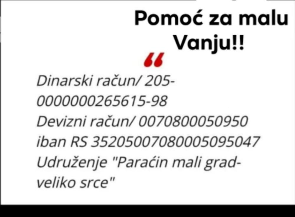 Svako ko može da pomogne novčano, uplatom na žiro račun koji objavljujemo, u vidu garderobe, paketa, higijene, tehničkih uređaja, bele tehnike, Vanji će mnogo da znači... Ovo je još jedna šansa da pobedimo siromaštvo i da još jednom detetu promenimo život. Svi mi.