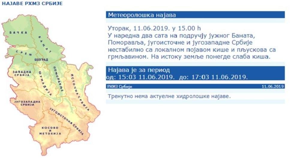 Republički hidrometeorološki zavod najavio je da će u naredna dva sata na području južnog Banata, Pomoravlja, jugoistočne i jugozapadne Srbije nestabilno sa lokalnom pojavom kiše i pljuskova sa grmljavinom. Na istoku zemlje ponegde slaba kiša, prenose beogradski mediji.