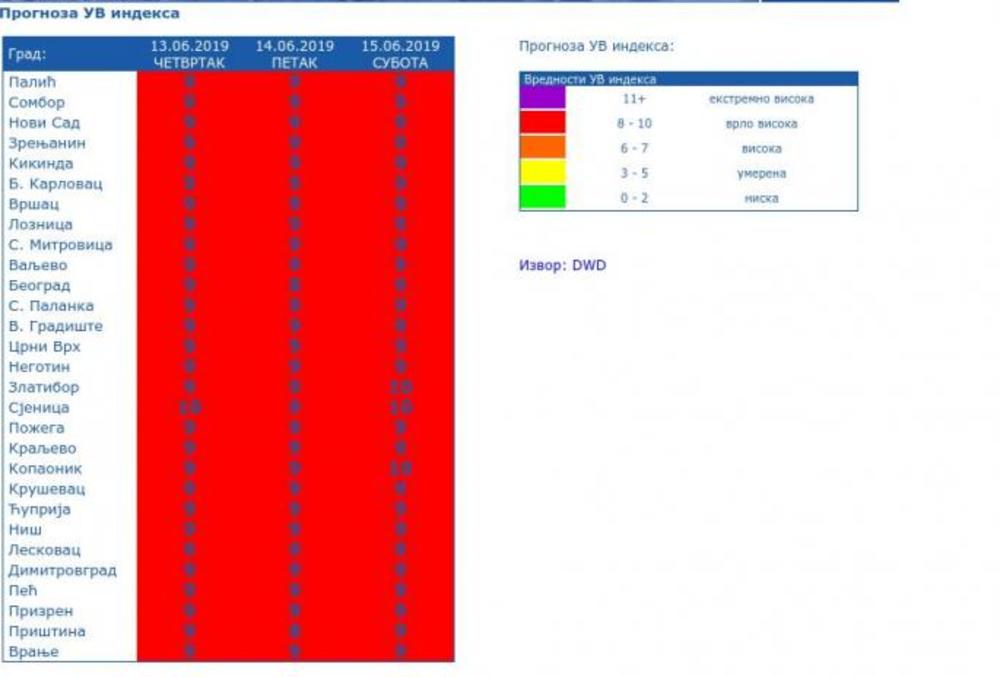 Indeks UV zračenja danas je najviši u Sjenici i iznosi 10, dok je, između ostalog, na Zlatiboru, Kopaoniku, u Beogradu, Novom Sadu, na Paliću, Nišu, Leskovcu 9.