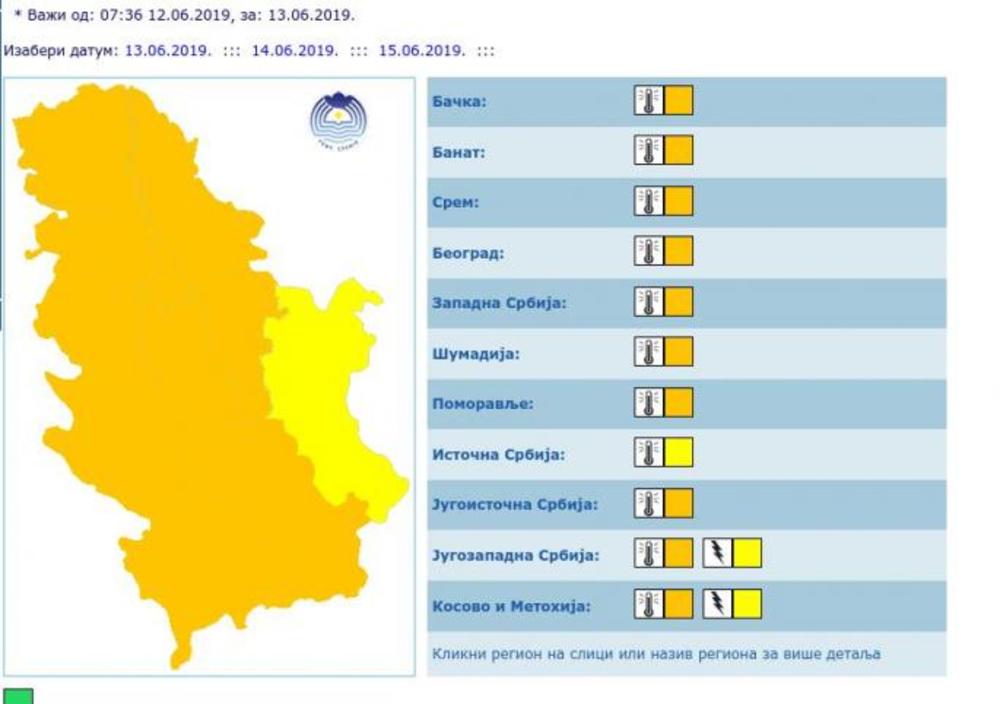 Najniža temperatura od 14 do 22 stepna, a najviša od 33 do 36, a na teritoriji Srbije je proglašen narandžasti meteoalarm, sem na istoku zemlje gde je na snazi žuti