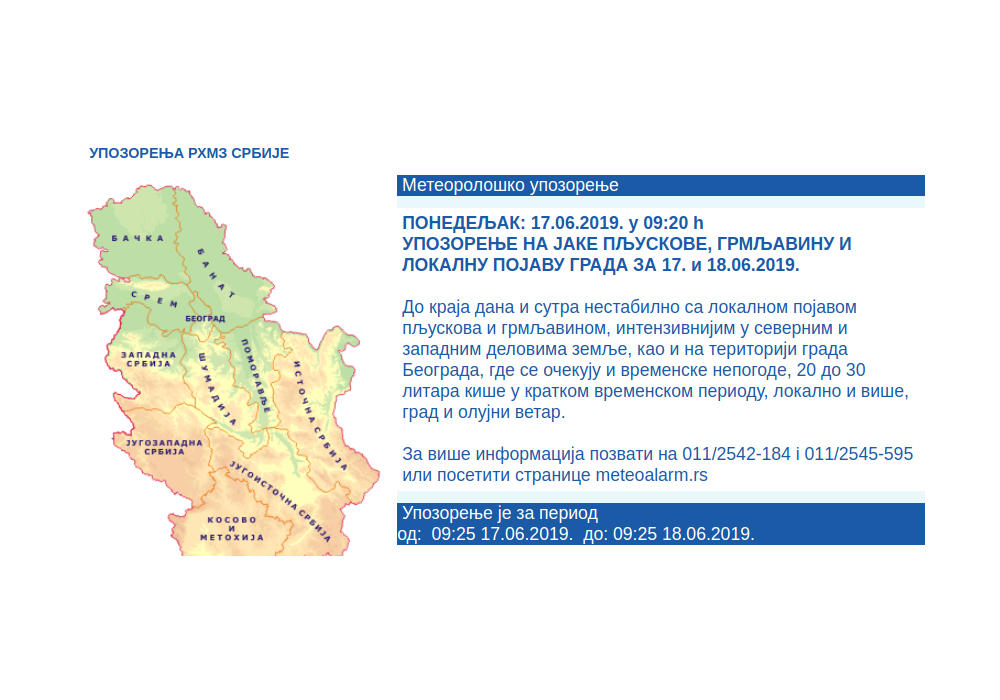 - Do kraja dana i sutra nestabilno sa lokalnom pojavom pljuskova i grmljavine, intenzivnijim u severnim i zapadnim delovima zemlje, kao i na teritoriji Beograda, gde se očekuju vremenske nepogode, 20 do 30 litara kiše u kratkom vremenskom periodu, lokalno i više, grad i olujni vetar - glasi upozorenje RHMZ koje je na snazi do sutra u 9.25.