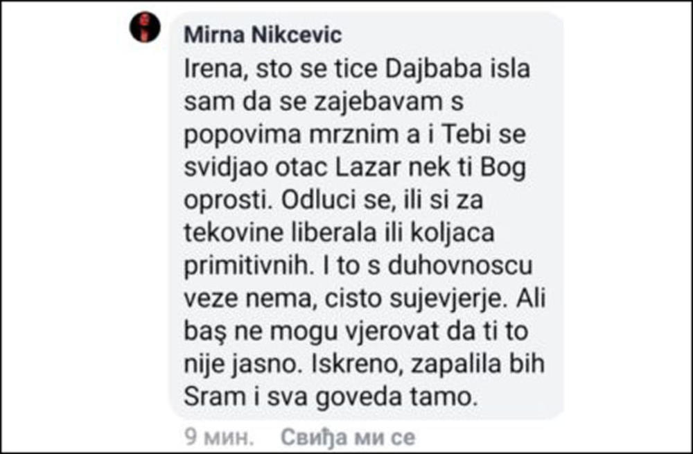 Irena, što se tiče Dajbaba išla sam da se zajebavam s popovima mrznim, a i Tebi se sviđao otac Lazar, nek ti Bog oprosti. Odluči se, ili si za tekovine liberala ili koljača primitivnih. I to s duhovnošću nema veze, čisto sujeverje. Ali, baš ne mogu vjerovat da ti to nije jasno. Iskreno, zapalila bih hram i sva goveda tamo, napisala je savetnica.
