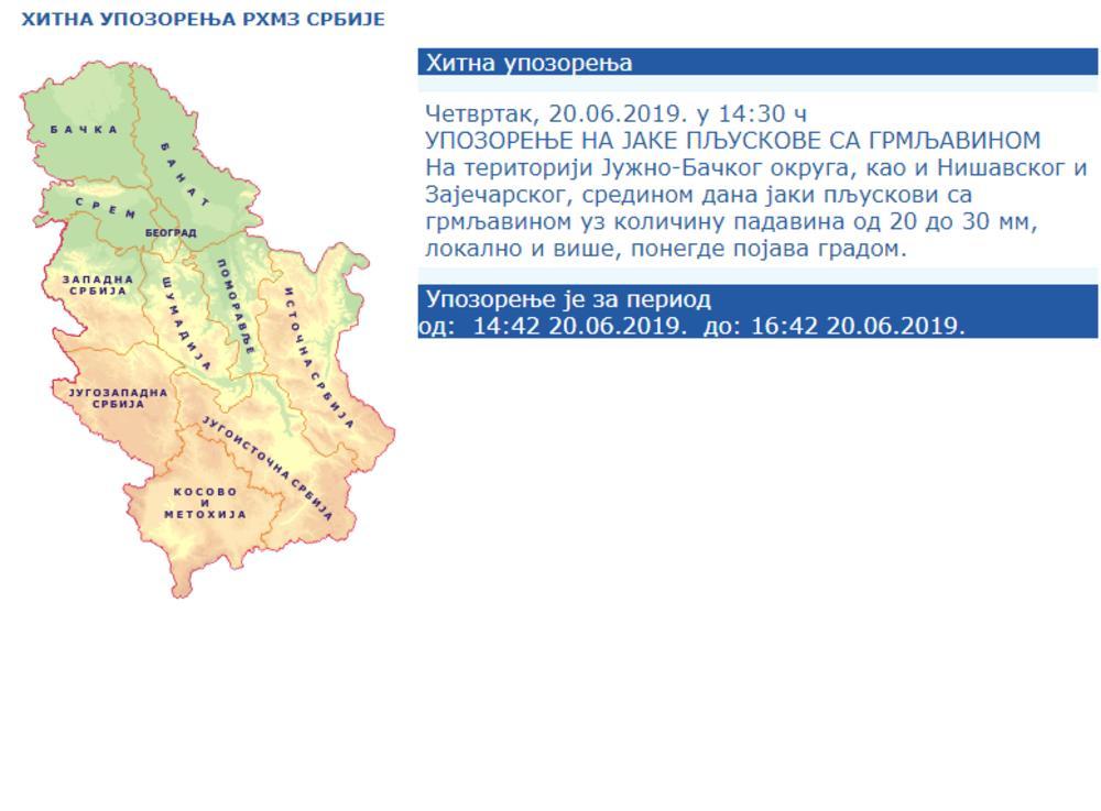 Kako se navodi na sajtu RHZS-a, pljuskova će biti na teritoriji Južno-Bačkog okruga, Nišavskog i Zaječarskog.