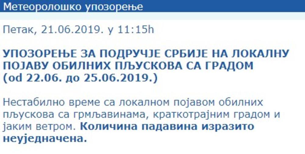 Republički hidrometeorološki zavod (RHMZ) objavio je danas novo upozorenje na lokalnu pojavu obilnih pljuskova sa gradom na području Srbije od sutra do 25. juna.