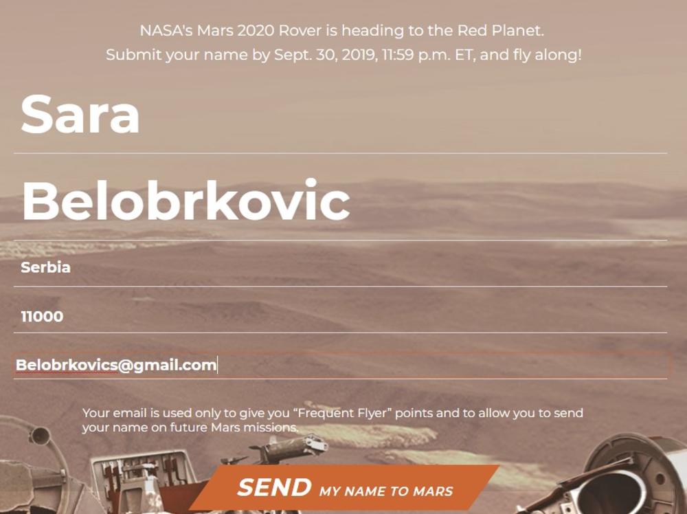 Tako će njeno ime biti među hiljadama onih koje će rover poneti na Crvenu planetu.