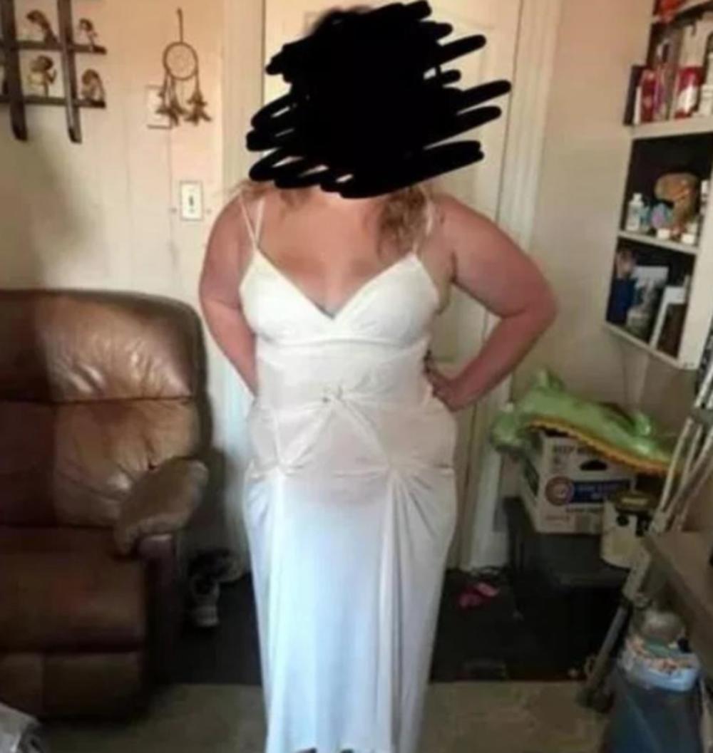 Umesto da je skrati po donjem rubu, prijateljica je napravila nabore na sredini haljine oko stomaka. Budućoj nevesti se, naravno, venčanica nije sviđala pa je upitala na Facebooku kako da sakrije ispupčenja na haljini.