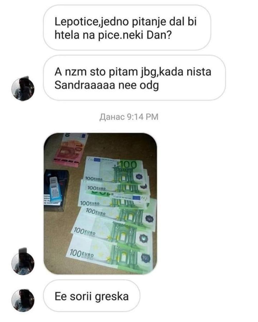 Kada je shvatio da neće dobiti Sandrin odgovor, momak je morao da se snađe i privuče joj pažnju tako što joj je poslao fotografiju na kojoj se vidi par novčanica u apoenima od 100 eura.