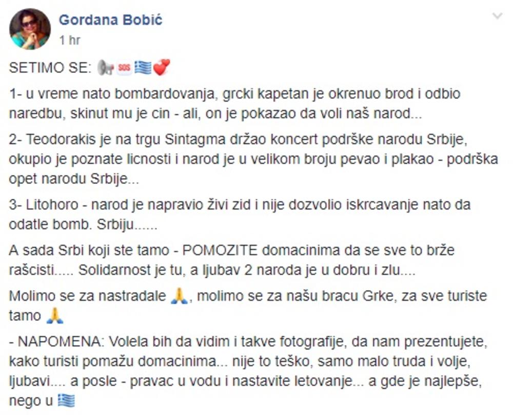 A sada Srbi koji ste tamo - POMOZITE domaćinima da se sve to brže raščisti. Solidarnost je tu, a ljubav dva naroda je u dobru i zlu. Molimo se za nastradale, molimo se za našu braću Grke, za sve turiste tamo", napisala je ona i pozvala sve da okače snimke i fotografije kako Srbi pomažu domaćinima.