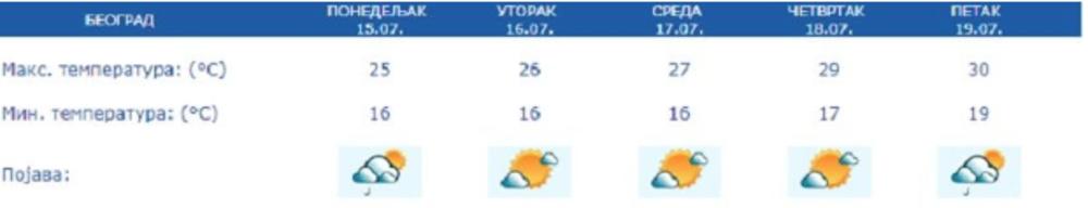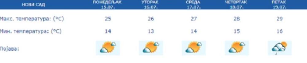 U četvrtak i petak posle podne i uveče u južnim i zapadnim predelima očekuje se jači razvoj oblačnosti i pojava lokalnih pljuskova sa grmljavinom. Maksimalna temperatura u utorak kretaće se od 23 do 27 stepeni, u sredu od 24 do 28 stepeni, a u četvrtak u većini predela do 30 stepeni.