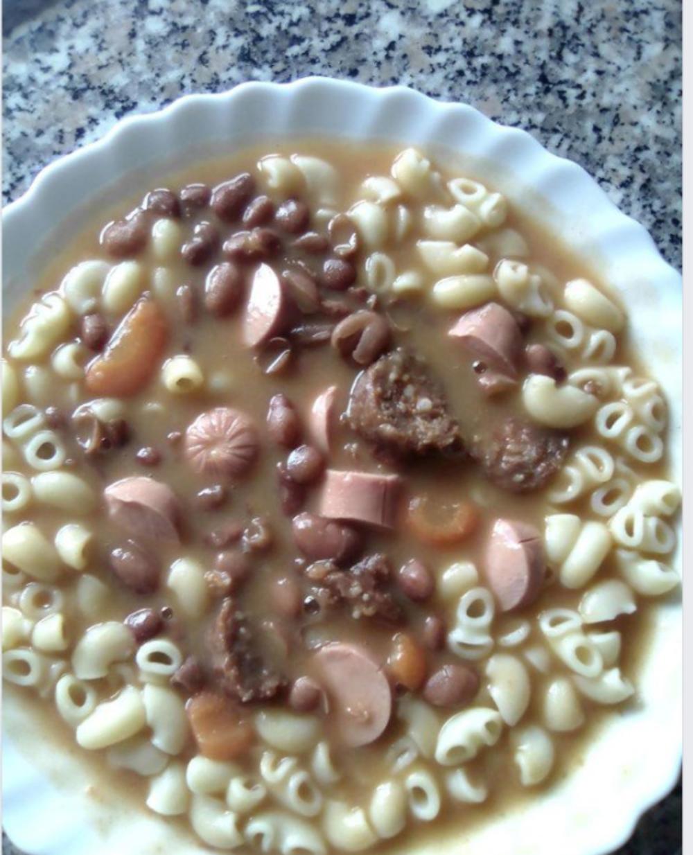 Devojka je podelila svoje jelo, za koje deluje da je sačinjeno od sledećih sastojaka: makarona, pasulja, viršli, kobasica i šargarepa, a sve je to skuvano i pomešano, ne bi li načinilo jedno jelo.