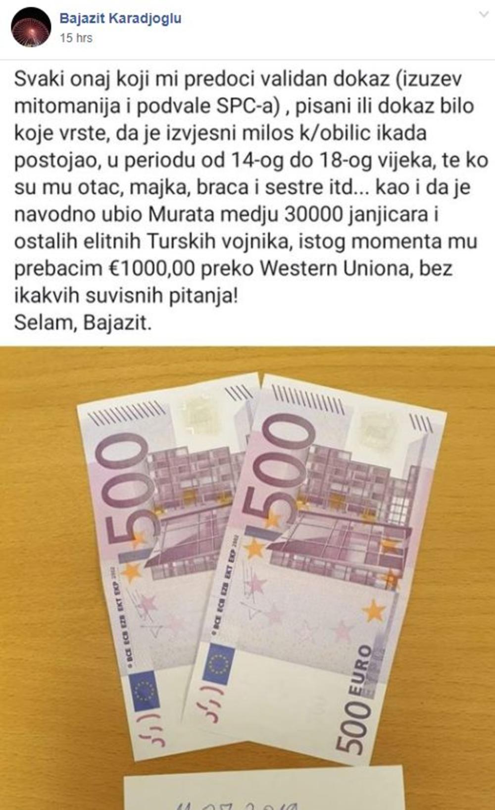 "Svaki onaj koji mi predoči validan dokaz (izuzev mitomanija i podvala SPC), pisani ili dokaz bilo koje vrste da je izvesni Miloš Obilić ikada postojao u periodu od 14. do 18. veka, te ko su mu otac, majka, braća i sestre itd., kao i da je navodno ubio Murata među 30.000 janjičara i ostalih elitnih turskih vojnika, istog momenta mu prebacim 1.000 evra bez ikakvih suvišnih pitanja", napisao je Bajazit.