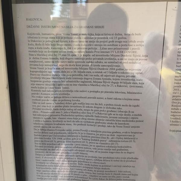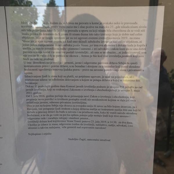 14:41 - Vesna je još uvek zatvorena, a na ulaznim vratima je okačila pismenu izjavu situacije koja ju je zadesila.