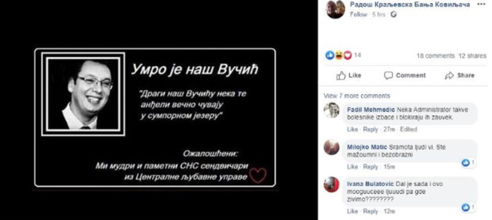 Ipak, pretnje upućene predsedniku Srbije ne prestaju, pa su jutros na Fejsbuku osvanule umrlice sa slikom Aleksandra Vučića.