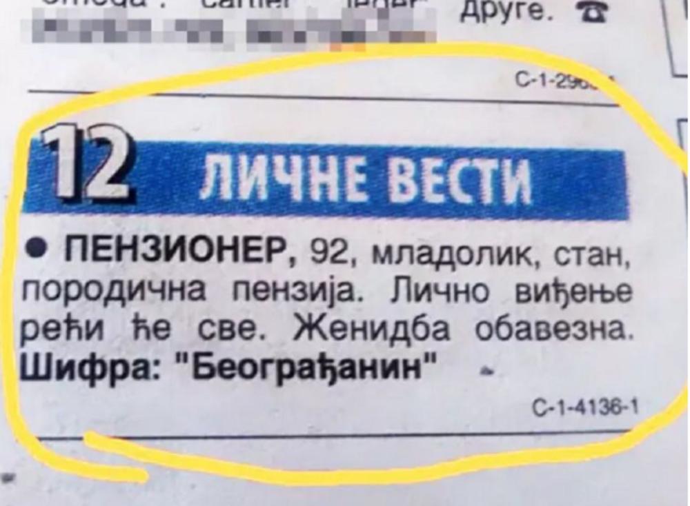 Danas se i mladi žale da teško nalaze partnera, a zamislite tek kako je starijima! Jedan usamljeni penzioner iz Beograda zato je ostavio oglas.