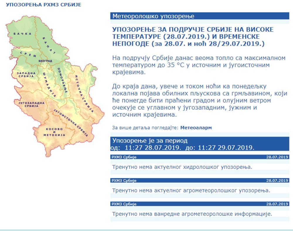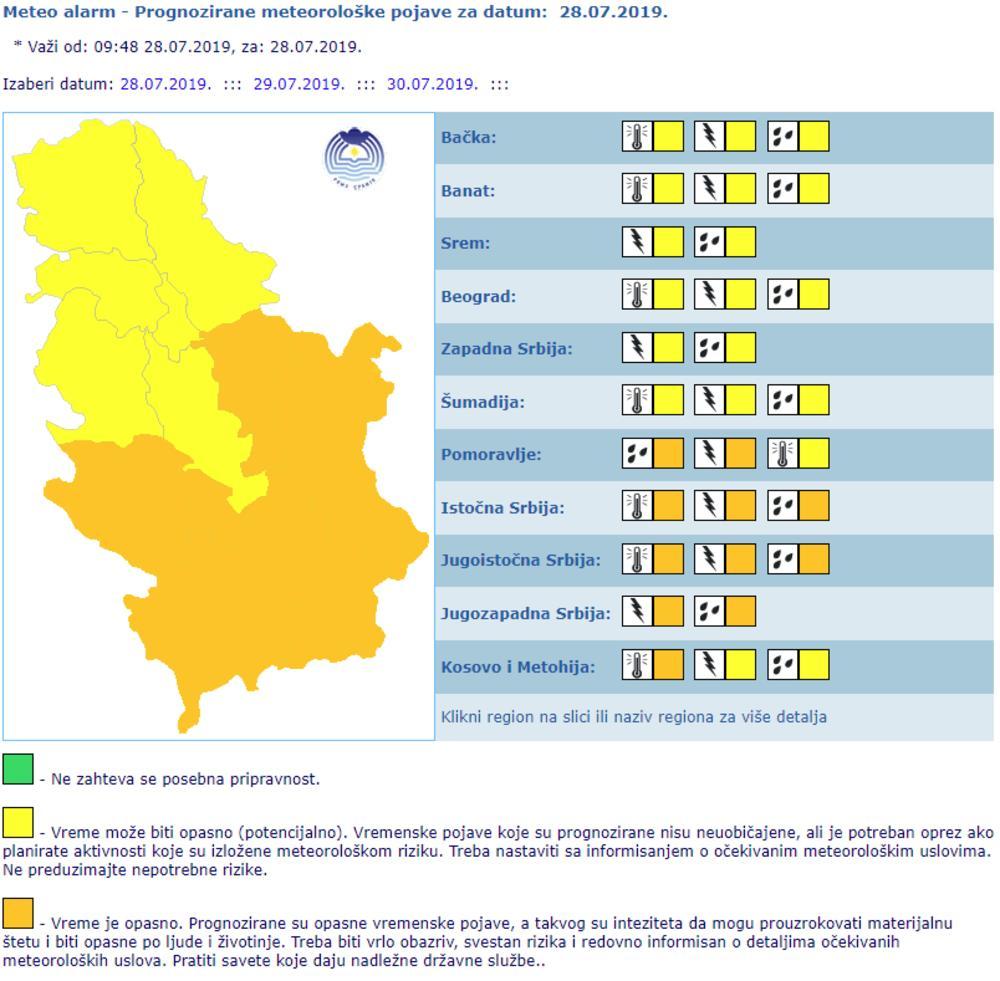 Na području Srbije danas će biti veoma toplo sa maksimalnom temperaturom do 35 °C u istočnim i jugoistočnim krajevima, međutim, izdat je žuti i narandžasti meteoalarm.