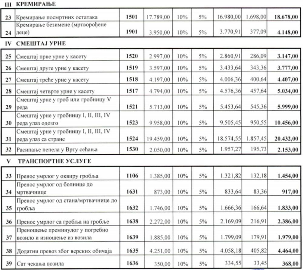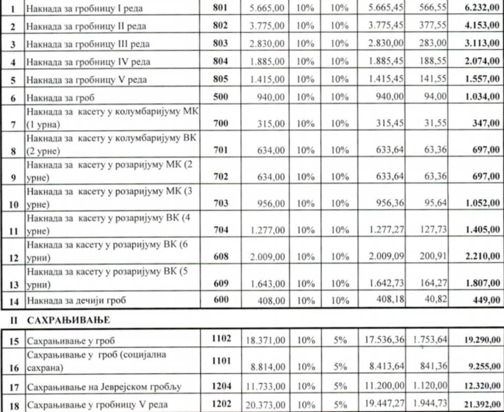 Osim toga, po novom cenovniku, spremanje umrlog u stanu iznosi 1.105 dinara, a sahranjivanje u grob košta 1.102 dinara.