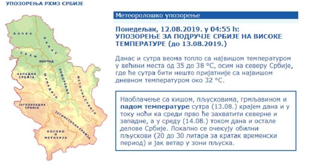 - Naoblačenje sa kišom, pljuskovima, grmljavinom i padom temperature sutra (13.08.) krajem dana i u toku noći ka sredi prvo će zahvatiti severne i zapadne, a u sredu (14.08.) tokom dana i ostale delove Srbije. Lokalno se očekuju obilni pljuskovi (20 do 30 litara za kratak vremenski period) i jak vetar u zoni pljuska - navodi se u upozorenju.