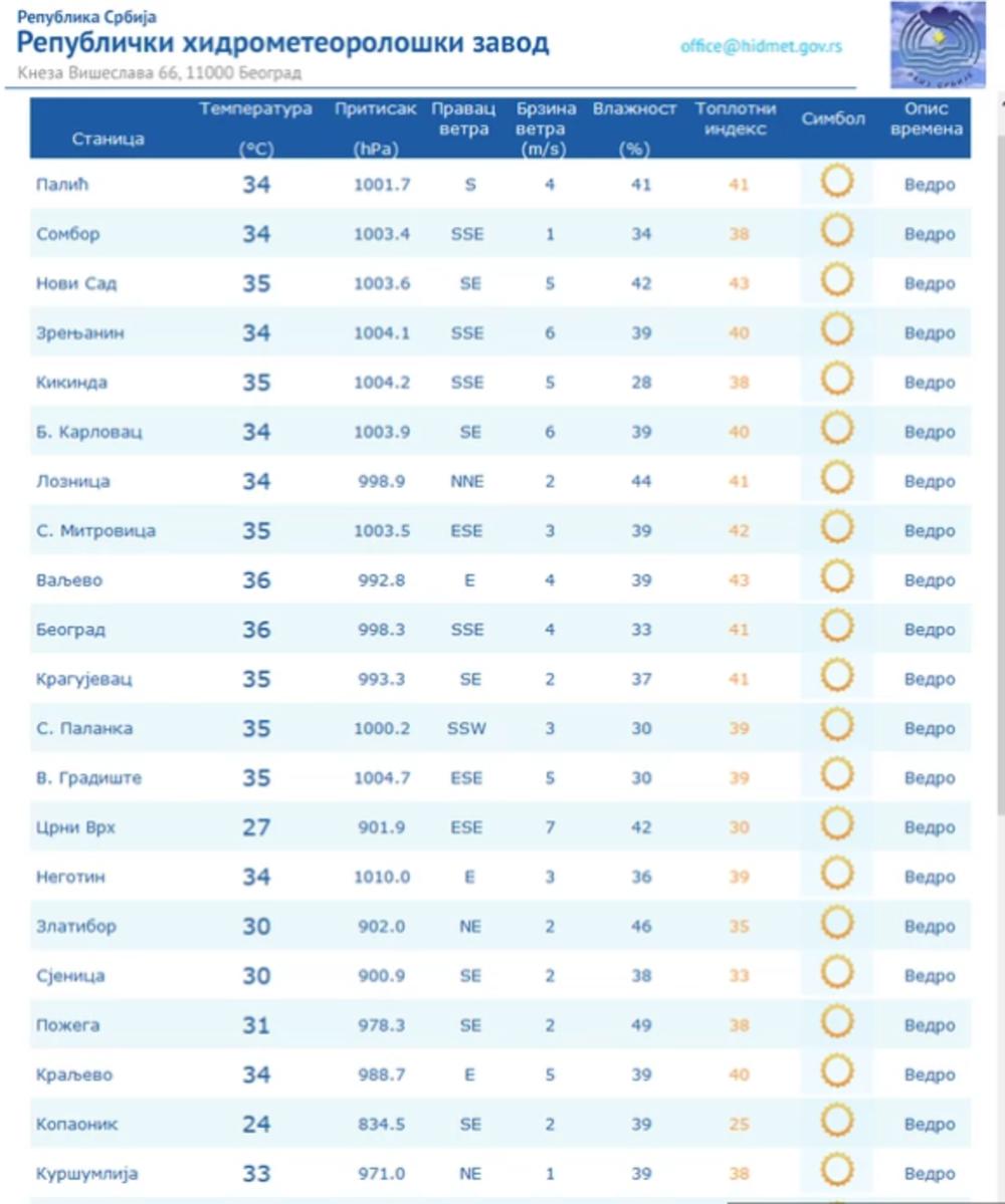 Naime, prema podacima Republičkog hidrometeorološkog zavoda, trenutno najtopliji srpski gradovi su Valjevo, Ćuprija i Beograd, gde je temperatura dostigla 36 stepeni. Iza njih se nalaze Novi Sad, Kikinda, Kragujevac i Vranje sa "skromnih" 35 stepeni. Temperatura za stepen niža zabeležena je u Zrenjaninu, Negotinu, Loznici, Kraljevu...