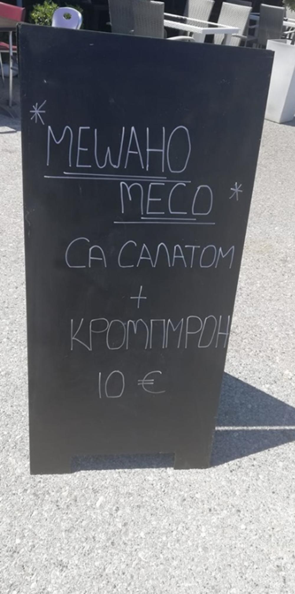 Kraj fotografije na kojoj se vidi tabla ispred restorana vidi se kako se Grk dobro potrudio da izađe u susret srpskim turistima i na našem jeziku napiše ponudu hrane.
