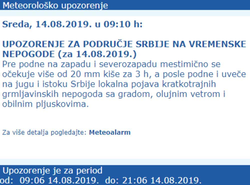 Kako se navodi, oblačnost koja će pre podne i sredinom dana na severu i severozapadu Srbije uslovljavati lokalno obilne pljuskove sa količinom padavina većom od 20 milimetara za tri sata, posle podne i uveče izmestaće se ka jugu i istoku Srbije.