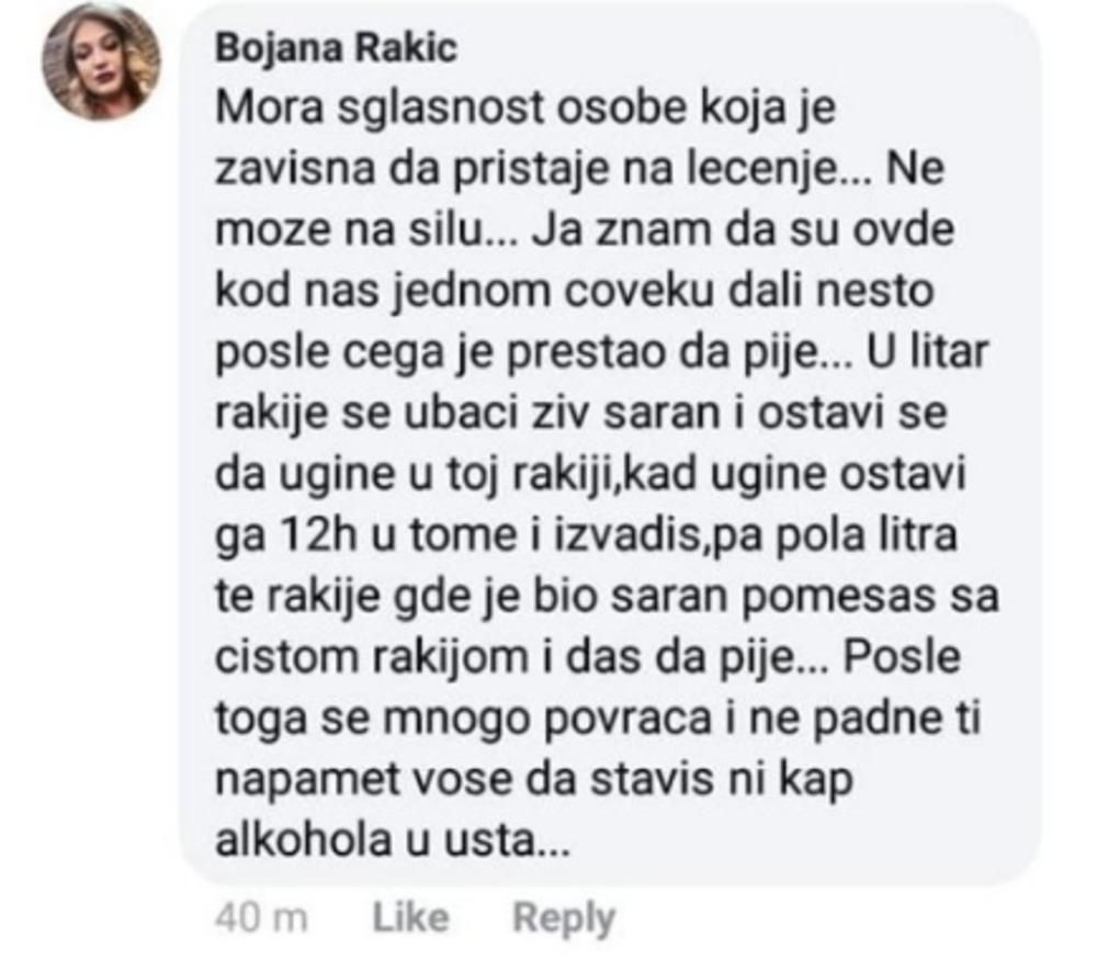 " Ja znam da su ovde kod nas jednom čoveku dali nešto posle čega je prestao da pije. U litar rakije se ubaci živ šaran i ostavi se da ugine u toj rakiji, kad ugine ostavi ga 12h u tome i izvadi, pa pola litra te rakije gde je bio šaran pomešaš sa čistom rakijom i daš da pije. Posle toga se mnogo povraća i ne padne ti na pamet više da staviš ni kap alkohola u usta".