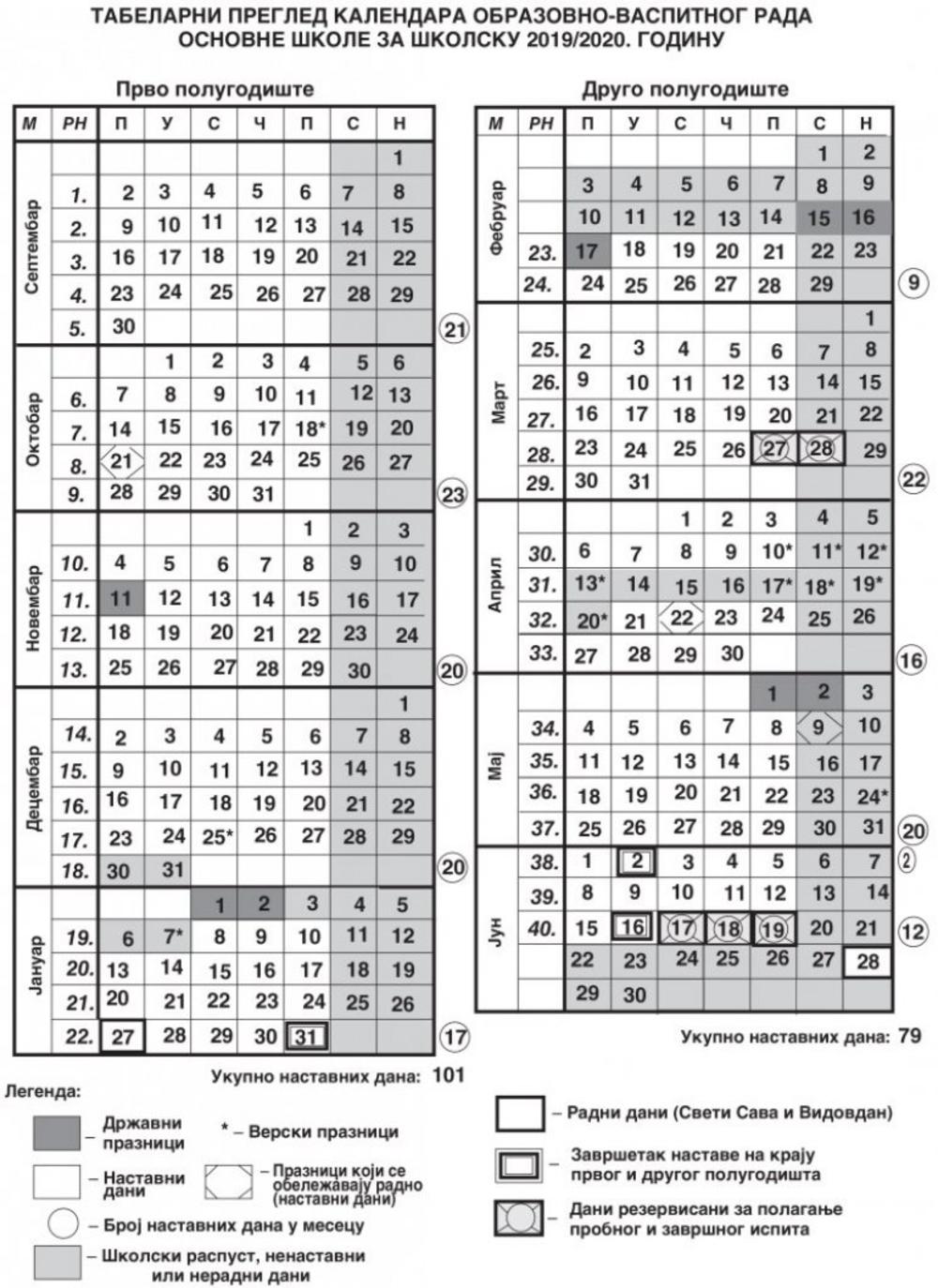 Prvo polugodište za osnovce i srednjoškolce počinje 2. septembra, a završava se 31. januara 2020. godine. U ovom polugodištu učenici će imati 101 nastavni dan.