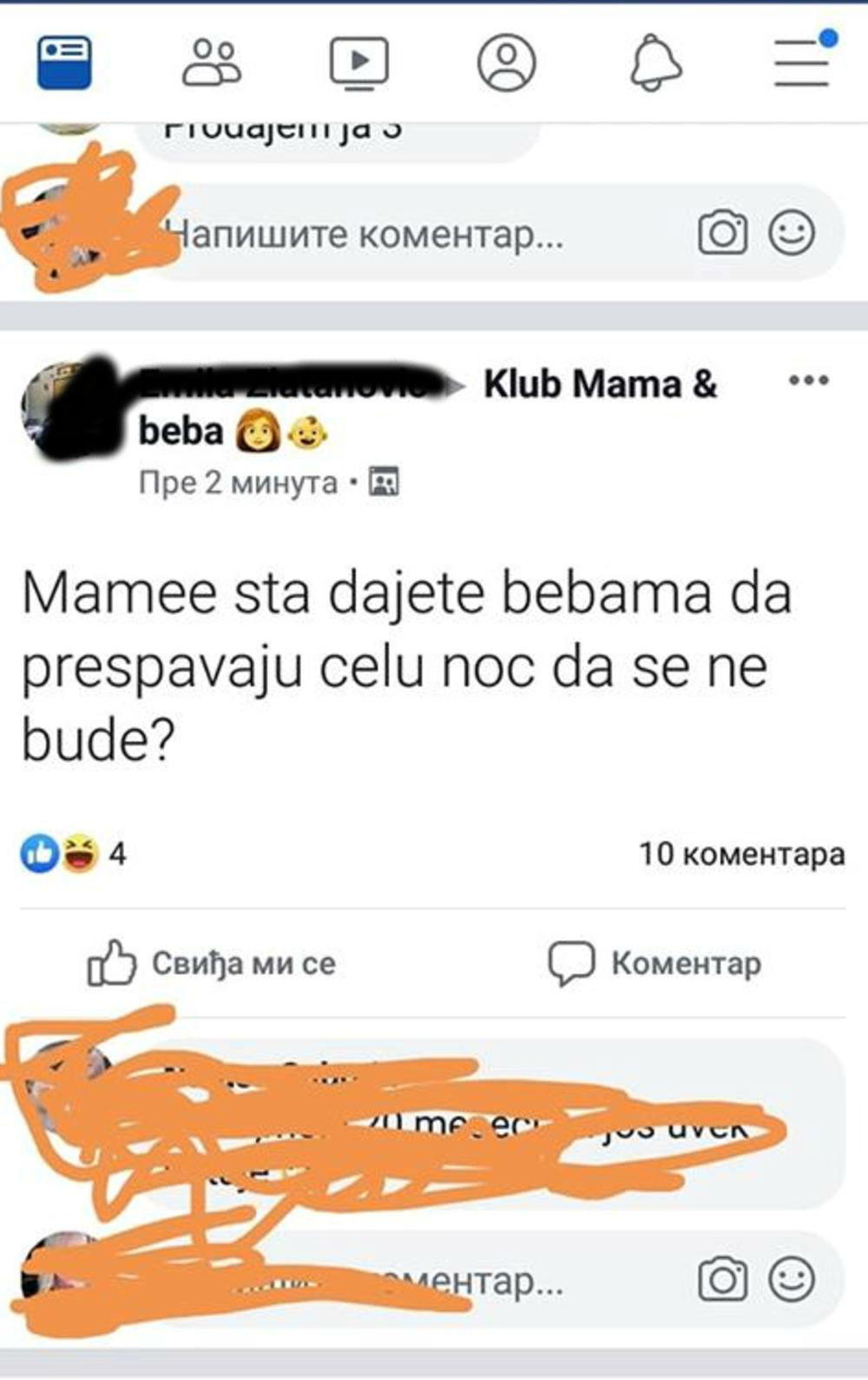 - Mame šta dajete bebama da prespavaju celu noć, da se ne bude? - napisala je ona.