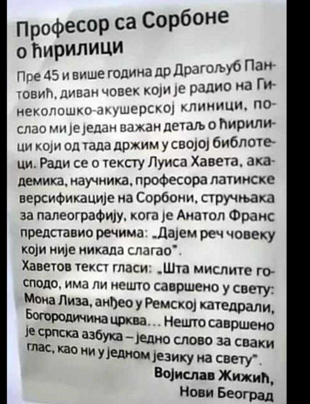 - Pre 45 i više godina Dragoljub Pantović, divan čovek koji je radio na Ginekološko - akušerskoj klinici, poslao mi je jedan važan detalj o ćirilici koji od tada držim u svojoj bibloteci. Radi se o tekstu Luisa Haveta, akademika, naučnika, profesora latinske versifikacije na Sorboni, stručnjak za paleografiju, koga je Anatol Frans predstavio rečima: "Dajem reč čoveku koji nikada nije slagao" - napisao je Žižić.