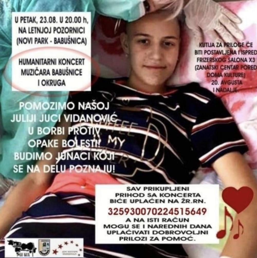 Udružene komšije i prijatelji organizvali su i humanitarni koncert u Babušnici, a sve u svrhu ne bi li se dobroj Juliji Vidanović pomoglo. Koncert će biti održan u petak 23. avgusta na Letnjoj pozornici u Babušnici, pa samim tim pozivamo sve da dođu i pomognu.