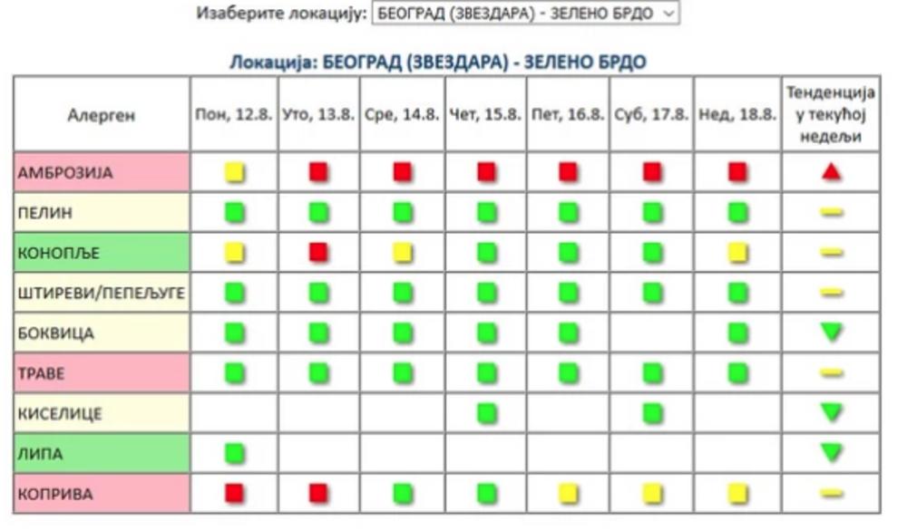 Dakle, deset puta više od maksimalne granične vrednosti. Podsetimo, prošle godine je prema ranije prezentovanim podacima, samo u pojedinim danima koncentracija ambrozije u Beogradu bila iznad 600...