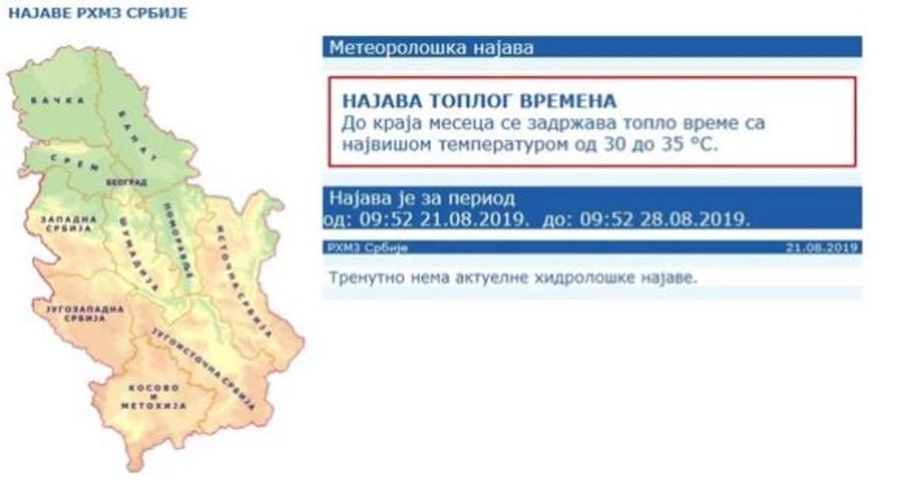 Do kraja meseca se zadržava toplo vreme sa najvišom temperaturom od 30 do 35 stepeni - stoji u najnovijoj najavi Republičkog hidrometeorološkog zavoda (RHMZ).