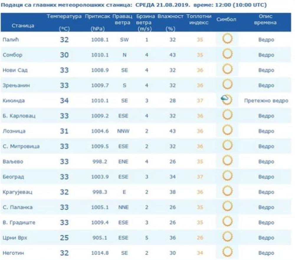 Prema poslednjim merenjima RHMZ, od 12 časova, najtoplije je trenutno u Kikindi gde je već 34 stepena, dok je samo nešto hladnije u Beogradu, Novom Sadu, Zrenjaninu, Valjevu, Ćupriji (33)...