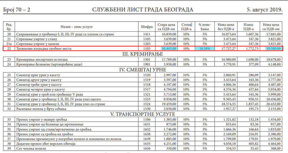 - Novi cenovnik JKP "Pogrebne usluge" Beograd koji je odobrila Skupština grada Beograda kao naš osnivač, stupio je na snagu 7.8.2019. godine. Cene osnovnih usluga JKP "Pogrebne usluge" nisu menjane od početka 2015. godine, dakle, više od četiri i po godine. Cene troškova sahranjivanja sada su povećane za pet odsto, što je znatno manje od kumulativnog iznosa inflacije za navedeni period, koji je iznosio 11,1% - saopštili su ranije iz JKP "Pogrebne usluge".