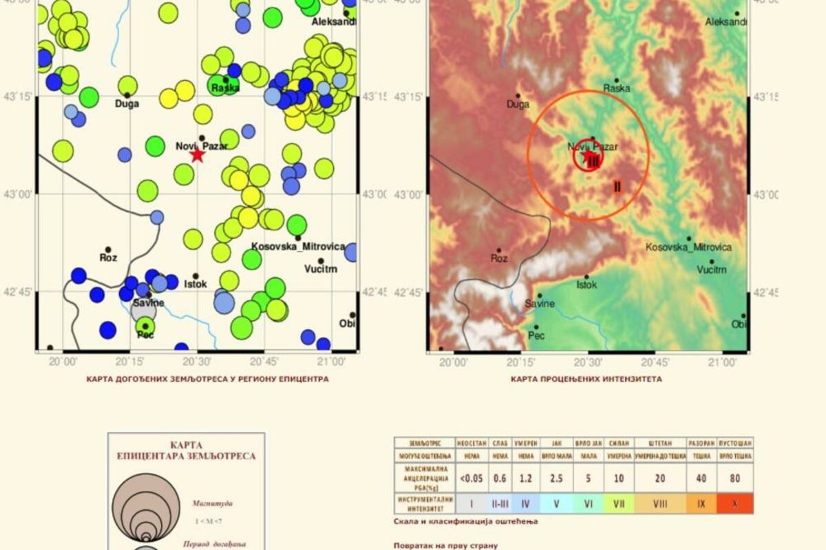 Potres se osetio u regionu mesta Novi Pazar, saopštio je Republički seizmološki zavod na svom sajtu. Intezitet u epicentru procenjen je na III stepena Merkalijeve skale.