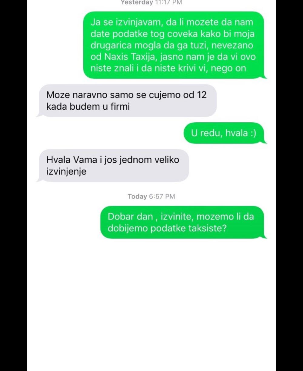 ''Od direktora pomenutog taksija nisam dobila nijednu informaciju kako bih mogla da tužim vozača, iako je istu noć kada smo prijavili slučaj poslao izvinjenje i rekao da će vozač biti otpušten", kaže Emilija.