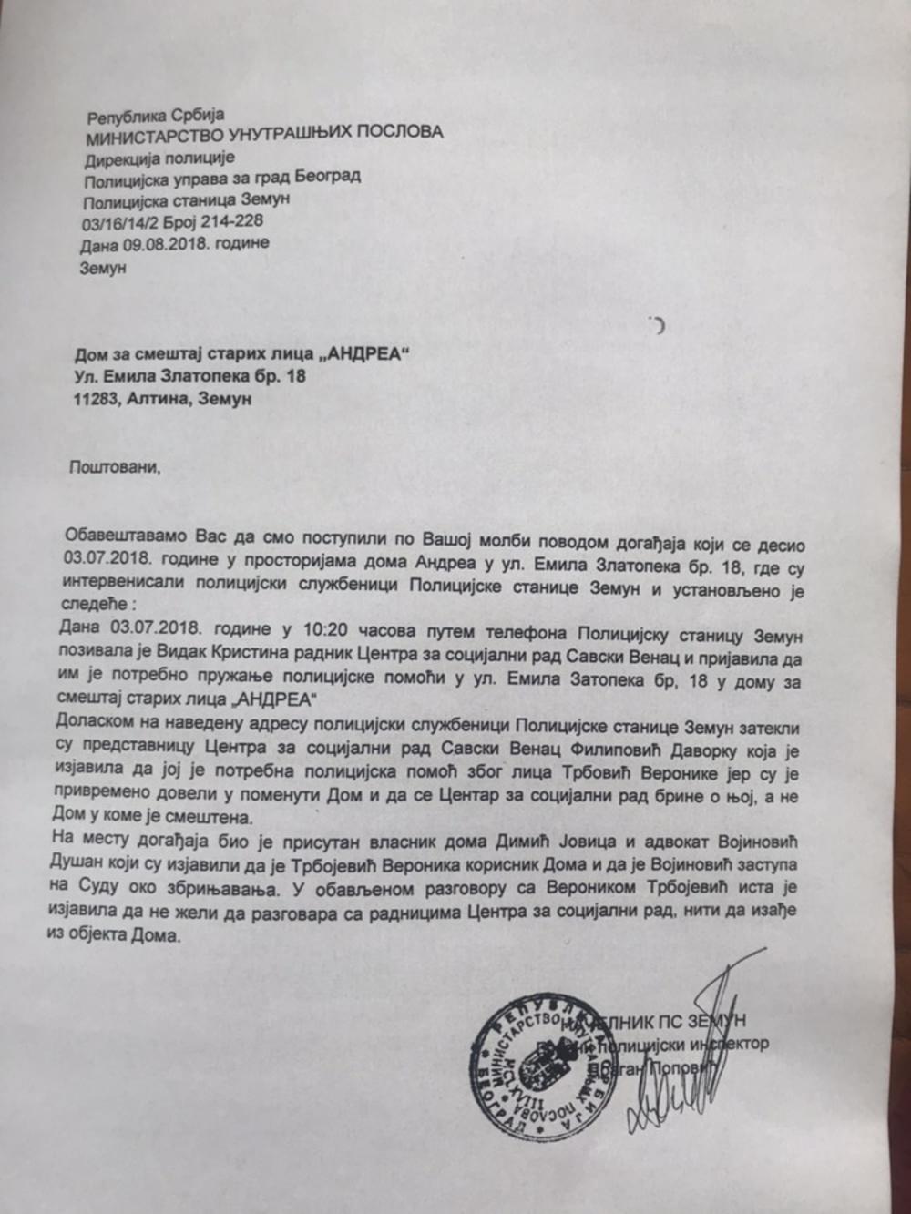 - Dolaskom na navedenu adresu policijski službenci Policijske stanice Zemun zatekli su predstavnicu Centra za socijalni rad Savski venac Filipović Davorku koja je izjavila da joj je potrebna policijska pomoć zbog lica Trbović Veronika jer su je privremeno doveli u pomenuti Dom i da se Centar za socijalni rad brine o njoj, a ne Dom u kome je smeštena. Na mestu događaja bio je prisutan i vlasnik doma Dimić Jovica i advokat Vojinović Dušan koji su izjavili da je Veronika Trbović korisnik Doma i da je Vojinović zastupa na sudu oko zbrinjavanja. U obavljenom razgovoru sa Veronikom Trbović ista je izjavila da ne želi da razgovara sa radnicima Centra za socijalni rad niti da izađe iz objekta Doma.