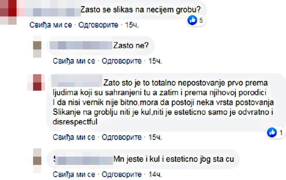"Zato što je to totalno nepoštovanje prvo prema ljudima koji su sahranjeni tu, a zatim i prema njihovoj porodici i da nisi vernik nije bitno, mora da postoji neka vrsta poštovanja, slikanje na groblju niti je kul, niti je estetično samo je odvratno i disrespectful", navodi se u jednom komentaru.