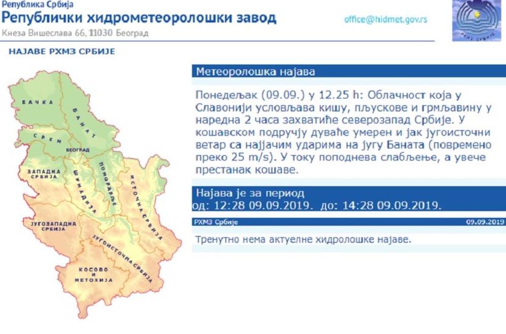 Prethodno je objavljeno upozorenje da se u poslepodnevnim satima, na severu Srbije lokalno očekuju kratkotrajne vremenske nepogode.