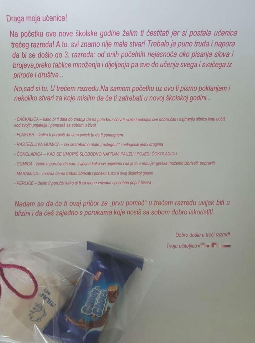 Upravo zbog toga nas je posebno dirnuo gest jedne učiteljice. Kako bi svojim đacima olakšala početak nove školske godine i na neki način proslavila njihov dolazak u treći razred, učiteljica u produženom boravku jedne riječke osnovne škole poklonila im je pismo i uz njega pribor za "prvu pomoć".