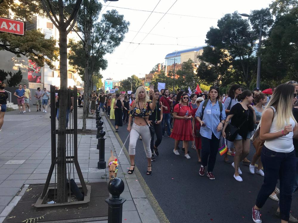 Prajd šetnja u Beogradu počela je u 17.30 časova. Šarenilo na ulicama, šljokice, šminka, baloni od sapunice samo su neki od prizora. No, svima prisutnim za oko zapala je jedna atraktivna plavuša, koja je na povodcu vodila okićenog psa.