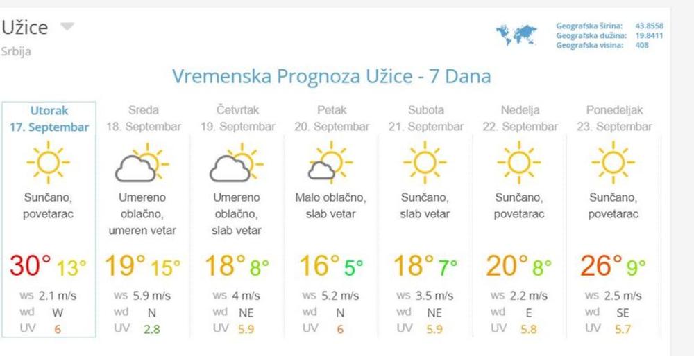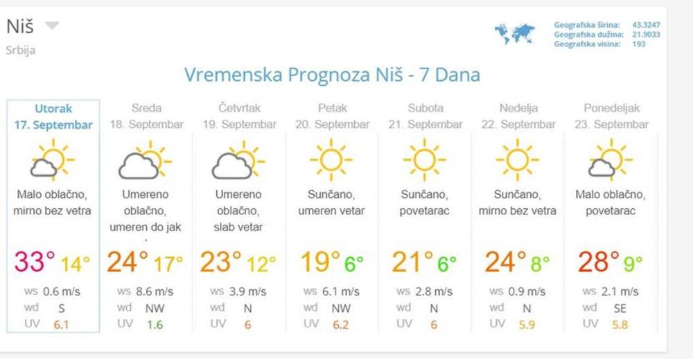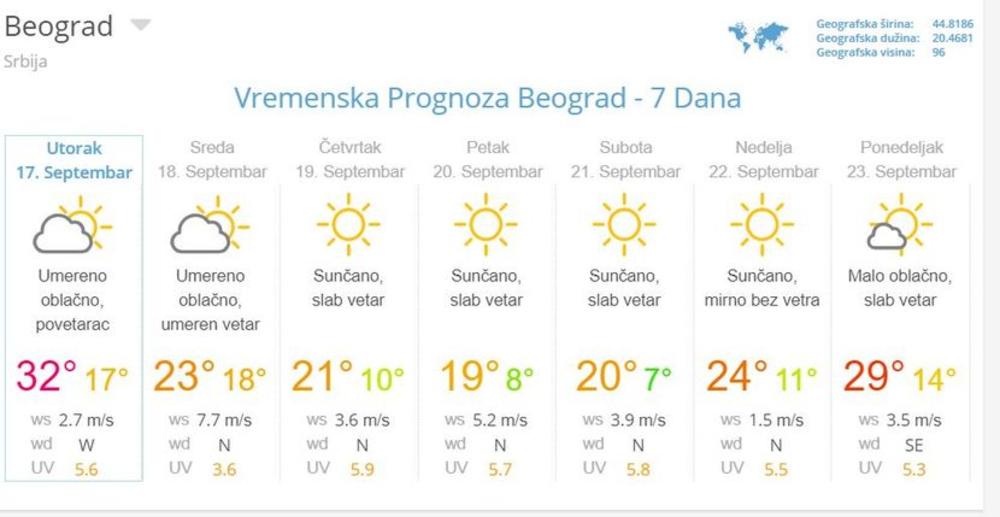 Maksimalna temperatura u sredu kretaće se od 16 stepeni na zapadu do 26 na jugoistoku Srbije.