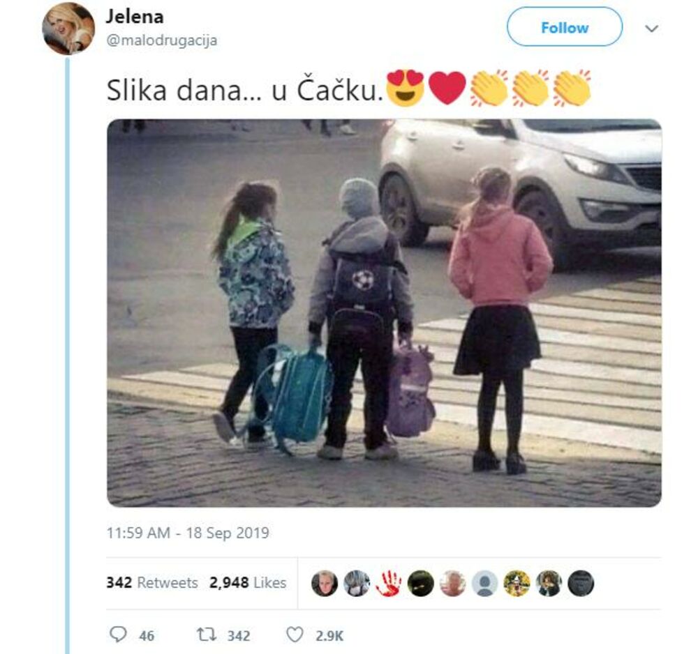 Na društvenim mrežama je kružila fotografija dečaka koji dvema devojčicama nosi školske torbe, koja je navodno nastala u Čačku.