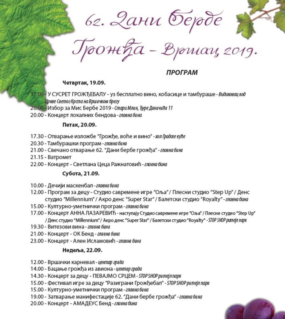 U petak će na glavnoj bini nastupiti Svetlana Ceca Ražnatović, u subotu nakon Vitezova vina na binu izlazi OK Bend, a zatim Alen Islamović, dok je nedelja rezervisana za Amadeus bend. Priliku da se predstave velikom broju posetilaca na glavnoj bini imaće i vršački bendovi, već u četvrtak.