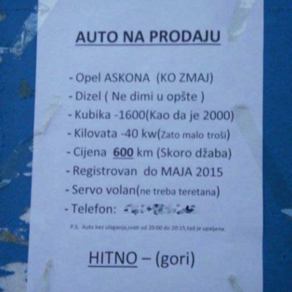- Prodajem jeftina kola. Šifra: Hitno, dok se Jefta ne vrati!