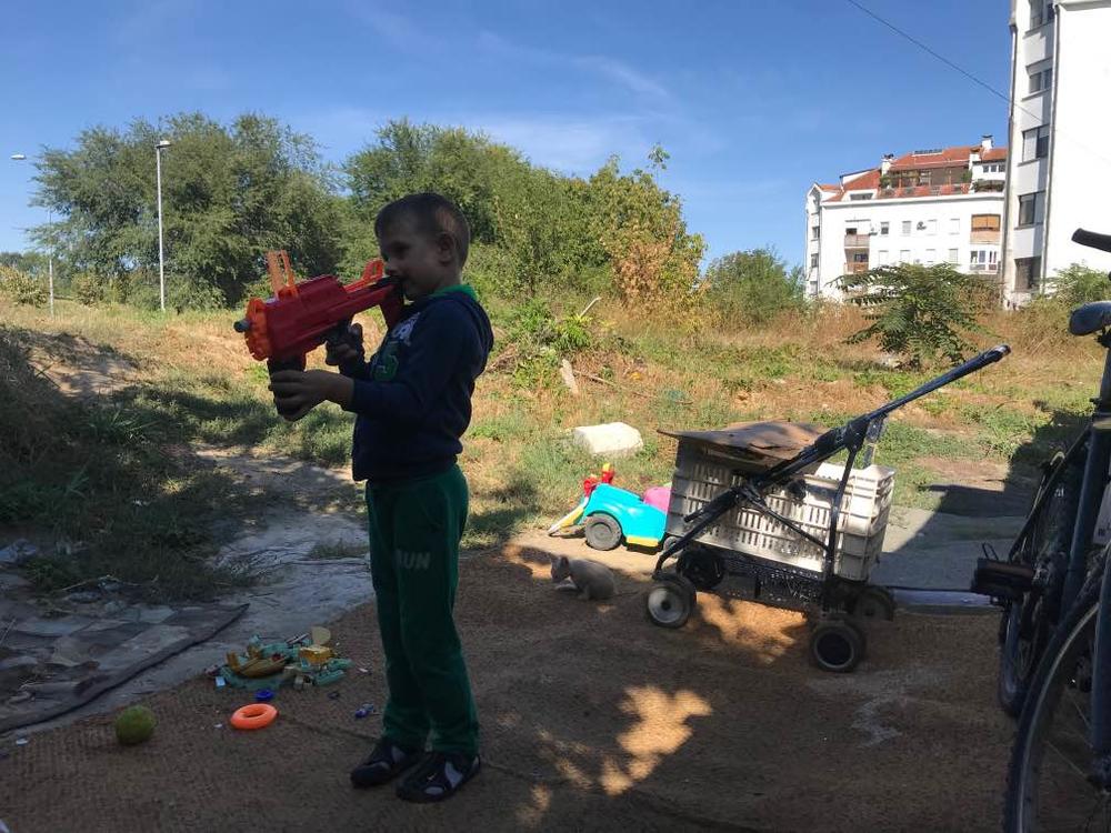 Dečak se igra oko dvorišta, tamo gde je nekad bio wc. Tu na poljani ispaljuje svoje plastične metke, iz svoje plastične puške, a potom ih sakuplja, i tako više puta, s beskrajnom energijom.