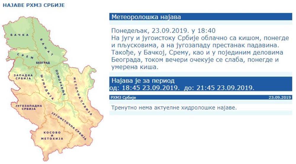 I u ostalim delovima zemlje će biti slično vreme. Očekuje se nestabilno vreme, mestimično sa kišom i lokalnim pljuskovima koji će na jugu ponegde biti praćeni grmljavinom. Već u toku poslepodneva na severu i zapadu zemlje dolazi do razvedravanja i prestanka padavina, a uveče i tokom noći i u većini krajeva Srbije.