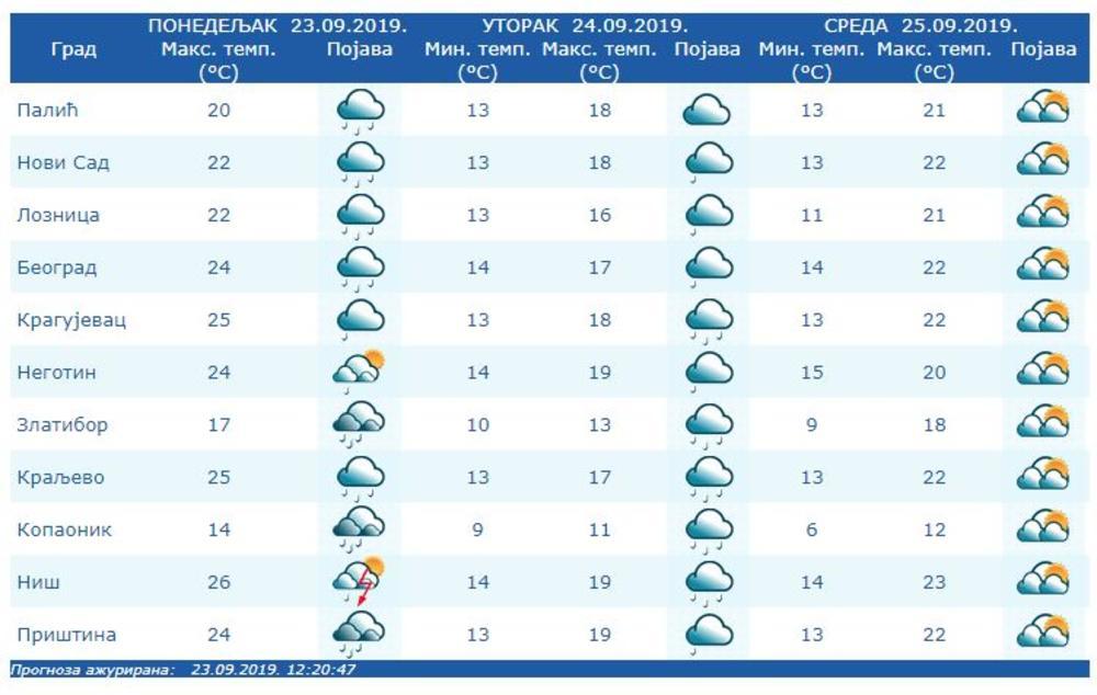U sredu stanovnike prestonice očekuje promenljivo oblačno, ali suvo i malo toplije vreme, sa temperaturom do 22 stepena. Kratkotrajna kiša očekuje se još ponegde u brdsko-planinskim krajevima.