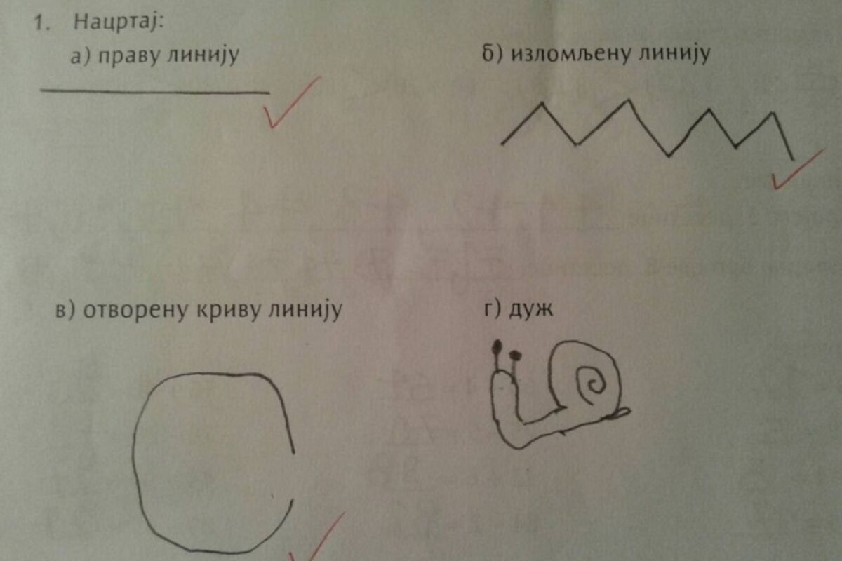 Prema zadatku, dete je trebalo da nacrta pravu, izlomljenu i otvorenu krivu liniju a na kraju i duž. Prva tri dela zadatka je dete odradilo perfektno a onda je došao red na duž i evo je: