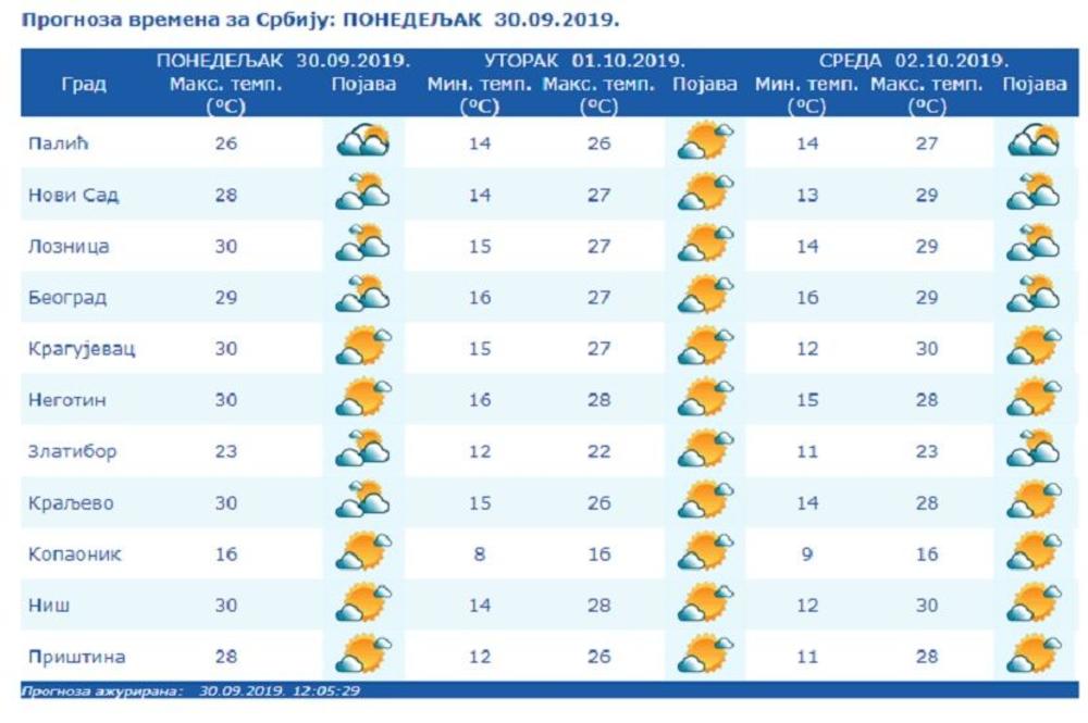 U Beogradu će sutra, posle oblačnog jutra, tokom dana biti pretežno sunčano i toplo. Vetar slab do umeren južni i jugoistočni. Jutarnja temperatura oko 16 °C, najviša dnevna oko 27 °C.
