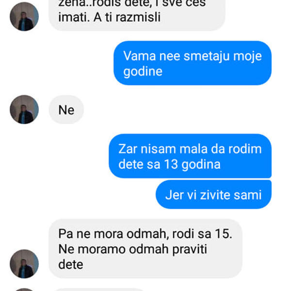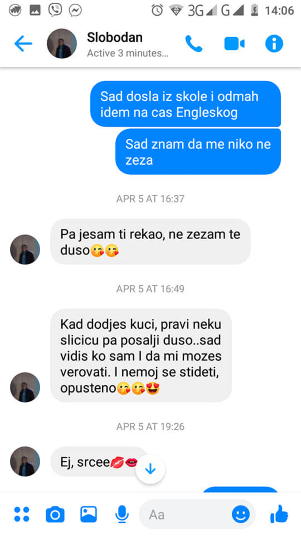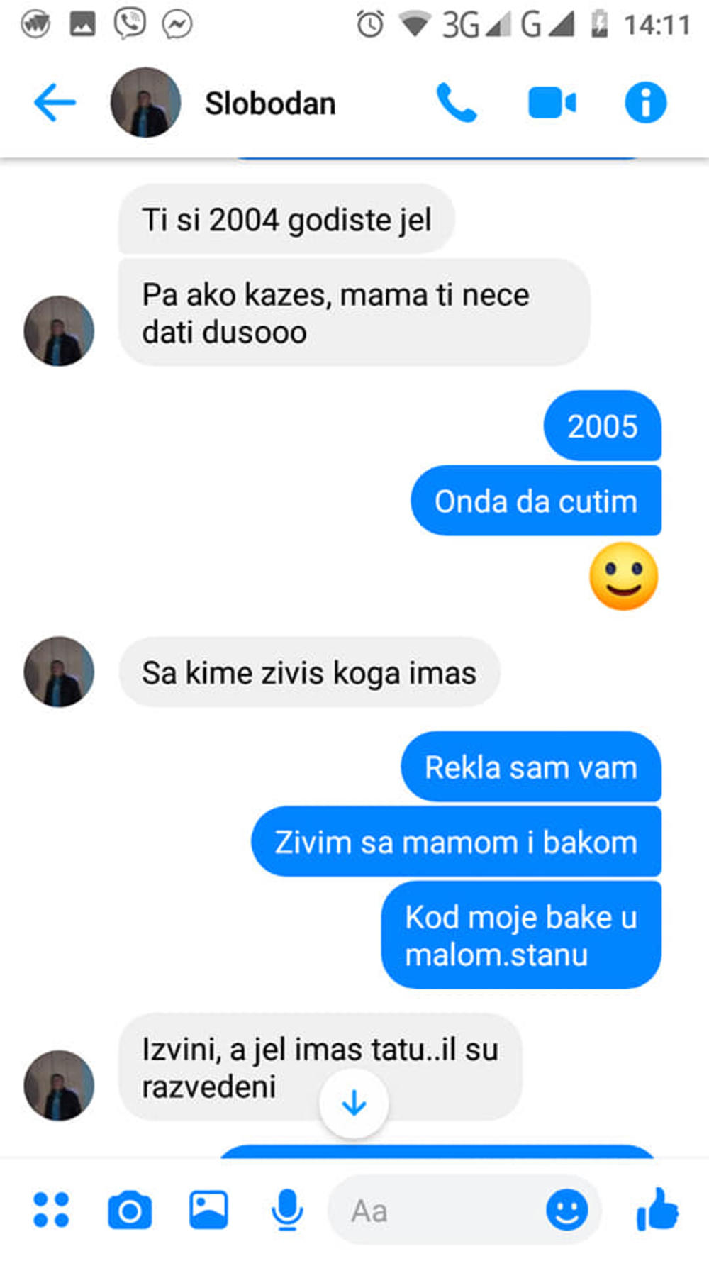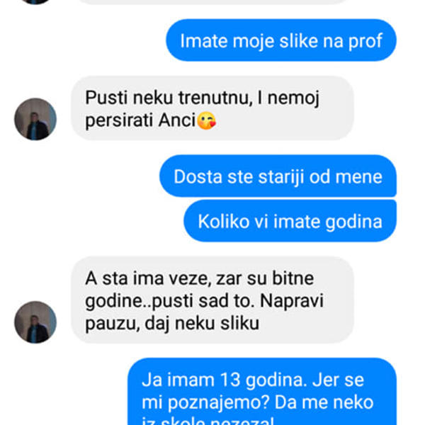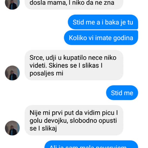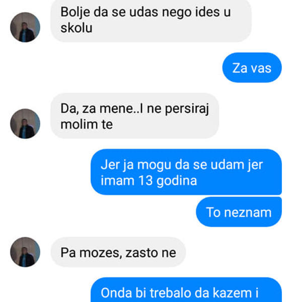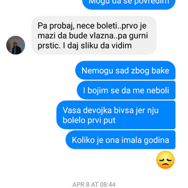 Devojčica ga je pitala da li je "njegovu bivšu devojku bolelo prvi put, i koliko je imala godina", da bi on napisao "isto kao ti, sedmi razred. malo je bolelo, bio sam nežan. Jesi li videla koliki je ku*ac?" - pisao joj je.